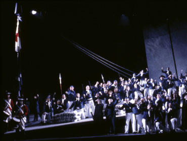 Billy Budd is Britten's gripping opera of sadism and injustice aboard a British man-o'-war. The libretto, by E.M. Forster and Eric Crozier, is based on the literary masterpiece by Herman Melville and tells the tale of a young seaman, Billy Budd, who is persecuted malevolently by his master-at-arms, Claggart. Accused of mutiny, the stammering Budd accidentally strkes Claggart dead and the tormented Captain Vere has no alternative but to hang him. The opera explores many universal themes - the individual at odds with society, the corruption of innonce, the continual conflict of good and evil - which no doubt lay close to the heart of Britten's own pacifism and are themes which are explored in much of his dramatic music. This production has Britain's leading operatic baritone, Thomas Allen, in one of his most distinguished roles, as Billy. He is noted not only for his superb abilities as a singer, but also for his acting skills, particularly necessary for the demanding role of the naive and virtuous character of Billy Budd. Philip Langridge as Captain Vere repeats his recently highly-praised portrayal.