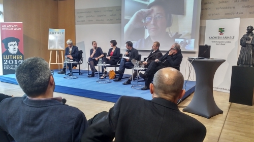 Am Mittwoch, den 11. Oktober, stellten die Initiatoren Manon Bursian (Vorstand der Kunststiftung Sachsen-Anhalt), Torsten Bönnhoff (Geschäftsführer Arthaus Musik) und Claudia Brinker (Orchesterdirektorin der Staatskapelle Halle), Michael Wendeberg (1. Kapellmeister der Oper Halle), Oscar Strasnoy (Komposition), Christoph Hein (Libretto) sowie Andreas Morell (Regisseur Licht) im Rahmen einer Pressekonferenz in der Vertretung des Landes Sachsen-Anhalts beim Bund die Uraufführung des Oratoriums „Luther“ vor.