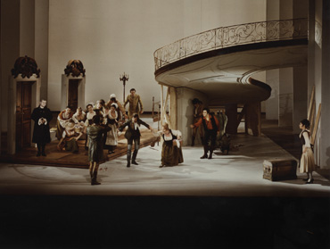 Walter Felsenstein (1901–1975), founder and general director of the Komische Oper in Berlin, was one of the twentieth century’s greatest creative theatre directors, who played a hugely important role in the revival of opera as a theatrical art form. A brilliant artist who directed over 190 productions during the course of his career, he was equally committed to the works, their creators, the ensemble and the audience. The Marriage of Figaro that received its premiere on 26 February 1975 in the Komische Oper Berlin was Walter Felsenstein’s last production and in many respects can be regarded as representing his legacy. Having just returned from directing a guest production at Vienna’s Burgtheater, Felsenstein had been working on Figaro since early February 1974. He had already directed three productions of the work – in 1934 in Cologne, in 1942 at the Salzburg Festival and in 1950 at the Komische Oper. For the latter production, he had used earlier translations as the basis for producing a new text version, but he now decided that this was inadequate, as he had reached the conclusion that from the point of view of both form and expression, rhyme was crucial at many points in the musical numbers. He also wanted to further fine-tune the formulation of the text – putting the emphasis on the sense rather than word-for-word equivalence (which was, in any case, impossible). For a 74-year-old, Felsenstein had a punishing work schedule. In addition to working on Figaro (translating the libretto, analysing the pieces with the conductor, working on the overall concept, holding discussions with the set and costume designers), he also had to find time for his work as General Director, for congresses, for a guest production of Bluebeard and for many other duties. His principle was, “always to start from the beginning again, to try to reach an understanding of the text and the music as though they had never before been interpreted or ‘understood’. I call it ‘taking the work literally’. And it is above all the music that has to be taken literally.” Thus he tried to approach even his fourth production of the work in a spirit of ‘naivety’, while, at the same time, benefiting from the experience gained with his previous productions. With inexorable meticulousness, Felsenstein pored over the opera, consulting its roots in the works of Beaumarchais and Paisiello (The Barber of Seville) in order to be able to understand the relationship between the characters in Mozart’s work.